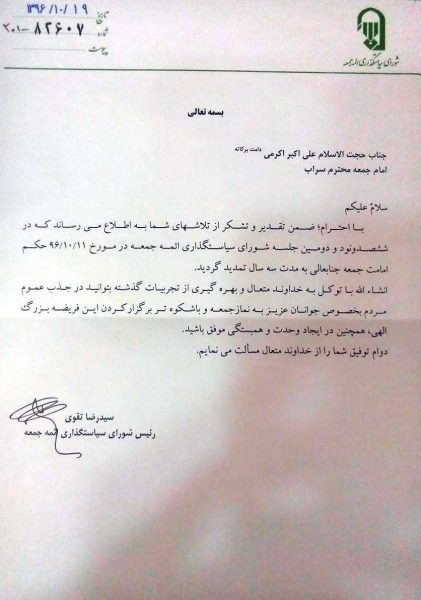 این گزارش حاکی است با توجه به اینکه حکم ائمه جمعه کشور سه ساله میباشد ،دوره دوم سه ساله اقای اکرمی به پایان رسیده و با ارزیابی های مختلف صورت گرفته حکم امامت جمعه وی سه سال دیگر تا تاریخ ۱۷دی ماه سال ۹۹ تمدید شد.