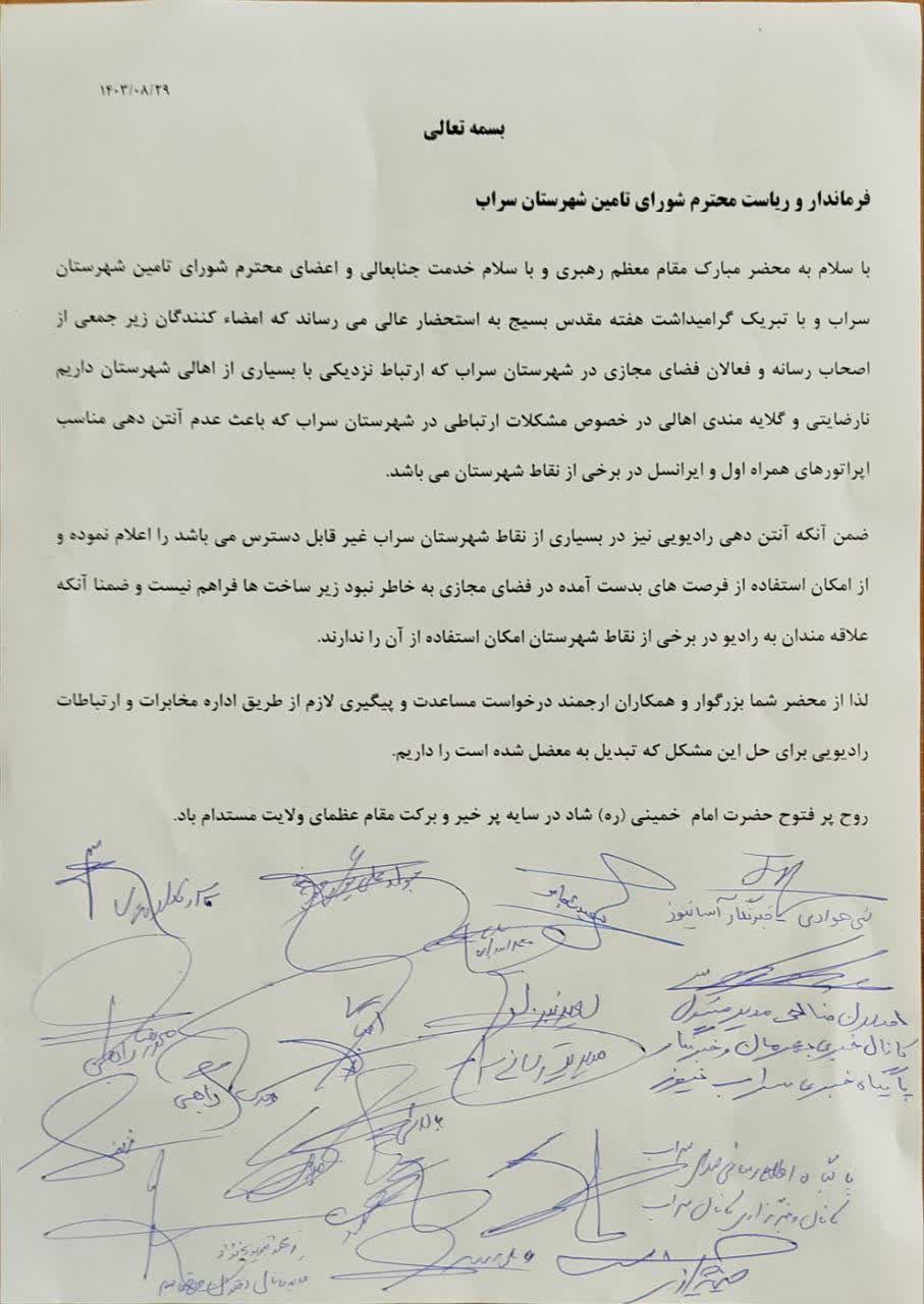 📍مطالبه قانونی جمعی از اصحاب رسانه ای شهرستان سراب از فرماندار (رئیس شورای تامین شهرستان سراب) در بابِ عدم آنتن دهی و اینترنت همراه نامناسب اپراتورهای همراه اول و ایرانسل مخصوصا در زمان قطعی برق ها در اغلب نقاط شهرستان سراب و مشکل آنتن دهی رادیو و تلویزیون در شهرستان سراب.